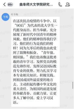 习近平总书记在给北京大学援鄂医疗队全体90后党员的回信中指出,“在新冠肺炎疫情防控斗争中,你们青年人同在一线英勇奋战的广大疫情防控人员一道,不畏艰险、冲锋在前、舍生忘死,彰显了青春的蓬勃力量,交出了合格答卷。广大青年用行动证明,新时代的中国青年是好样的,是堪当大任的!”危难时刻,方显英雄本色,在祖国最需要的时候,数以万计的90后、00后“白衣天使”奔赴前线。同为90后的我们,应该像他们一样奉献,勇敢承担重任,坚定前行。