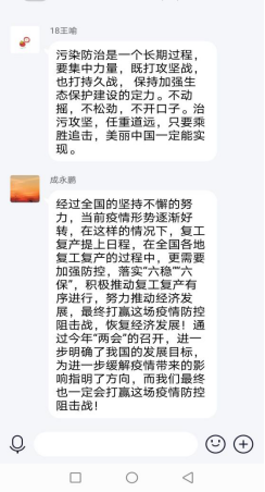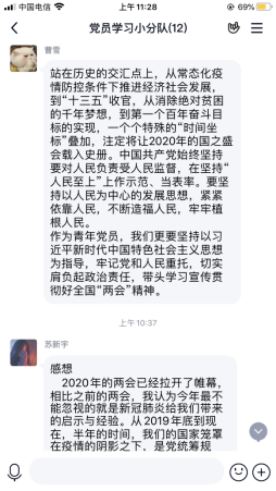 刘伟强调,要依托学习强国平台,充分学习关于两会的议题和新闻,聚焦两会精神。党员们就污染防治、精准扶贫、复产复工、全面建成小康社会等一系列两会热点进行了分组讨论,他们纷纷表示,中国的年轻一代必须要坚持中国共产党的领导,要回归初心、铭记初心、坚守初心,续写正气充盈的红色基因谱系。