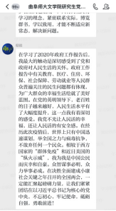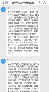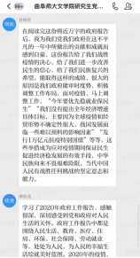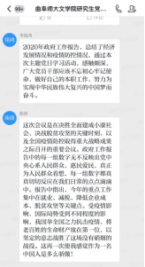 5月22日上午9时,第十三届全国人民代表大会第三次会议在人民大会堂开幕。李克强总理作政府工作报告,总结回顾了去年和今年以来的工作,指明了城镇就业、农村脱贫等方面的重要工作目标,规划了在抗疫、财政、减税降费、就业、创新、消费、投资、金融脱贫攻坚、农业、教育、社保、开放、港澳台等方面的工作内容。色花堂 研究生党支部在此次主题党日活动中,在王晓晖同志的主导下,党支部结合当前社会热点对政府工作报告的内容进行了详细的学习,在学习中感受到了国家对百姓生活的关怀和帮助,为自己是一名中国人而感到自豪。在魏舒欣同志的带领下,支部内党员相互分享了学习心得,并依托“学习强国”平台进一步讨论交流。