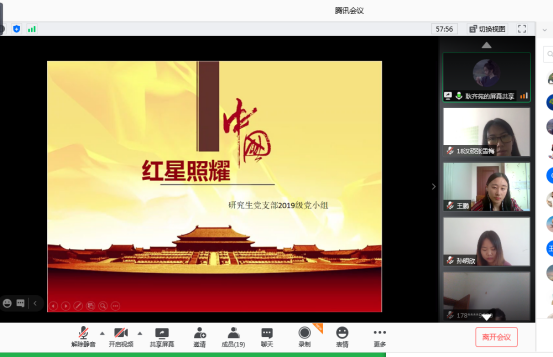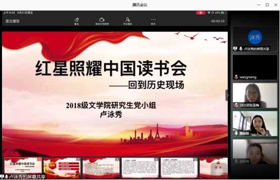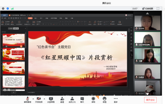 2020年8月21日上午,色花堂 研究生党支部通过腾讯会议开展了以品读《红星照耀中国》为主题的线上红色读书会主题党日活动。活动由党支部书记魏舒欣主持,2018、2019级党小组参与会议,会上两个党小组的党员同志结合自身专业学习、学术特色和个人实践经历,分享了对《红星照耀中国》的理解和感悟。
