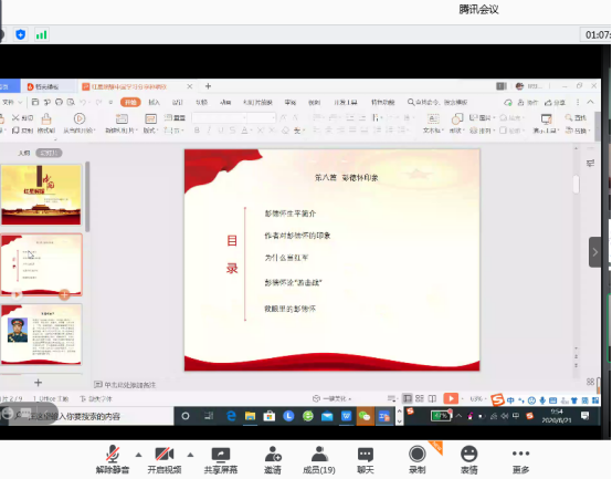 2019党小组的党员同志结合作品中的人物特点,以及自身的感受分享了读书感悟。杨亚妮分享《红星照耀中国》第四章——一个共产党员的由来,介绍了毛泽东同志思想的形成过成;耿齐苑同志谈到,红军精神是一笔个人财富,一直激励着我们不断前行;刘雨昕认为,红军长征中国革命史最精彩的内容,斯诺从客观的角度对长征的整个过程进行了生动的描写,红军精神是一笔宝贵的精神财富,需要我们努力传承,让长征精神永垂不朽;孙明欣同志介绍了彭德怀的生平,总结作者在书中对彭德怀的印象、彭德怀的参军历程。