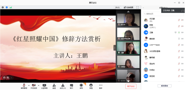 2018级党小组的党员同志从文学作品赏析的视角,带领大家进行共同学习和赏析作品。卢泳秀同志从文学体裁、作品内容两个方面介绍《红星照耀中国》,与大家分享了自己的个人感受“读史明智——传承革命精神”,与人民打成一片的优秀中国共产党领袖,是一群敢爱敢恨,真心的为人民服务的共产党员,这让我们深切地认识到了共产党与人民的生活是密不可分的,这种感情源自于对祖国的热爱;马聪丹同志按照时间顺序介绍毛泽东同志的成长历程,一个共产党需要经历一番艰难的斗争才能逐渐成长起来,作为青年人,我们也要有成为一名合格共产党员的决心;王鹏同志从修辞方法的角度找出《红星照耀中国中》典型的修辞使用,介绍了借代、比喻、反问、设问、多种修辞方法的综合运用;张雪梅从她个人的读书初体验出发选取了三个片段进行赏析,并结合个人实践经历,谈了谈在汉语国际教育的实践中,我们的使命是传播中国优秀传统文化,做好汉语的传播者。屈安冉在分享中谈到,这部作品让我们再一次深刻体验了“不忘初心、牢记使命”。共产党宛如一颗光华璀璨、熠熠闪亮的“红星”,永远照耀朝气蓬勃的中国。