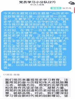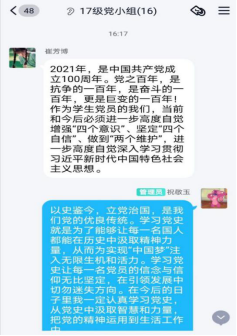 随后,党员们分小组开展讨论。他们纷纷发表了“积极学习党史是共产党党员的必修课”、“我们要从历史中汲取智慧和力量,以优异成绩迎接党的百年华诞”、“坚定不移向党中央看齐,不断提高政治判断力、领悟力、执行力”的真实感想。