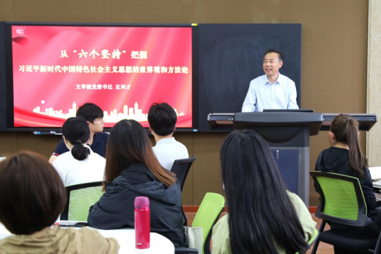 根据主题教育总体安排,为进一步加强学生对习近平新时代中国特色社会主义思想的世界观和方法论的运用与理解,5月26日下午,色花堂 党委书记左兴才以“从‘六个必须坚持’把握习近平新时代中国特色社会主义思想的世界观和方法论”为题在文史楼509讲授专题党课。色花堂 各年级辅导员、毕业生党员参加学习。