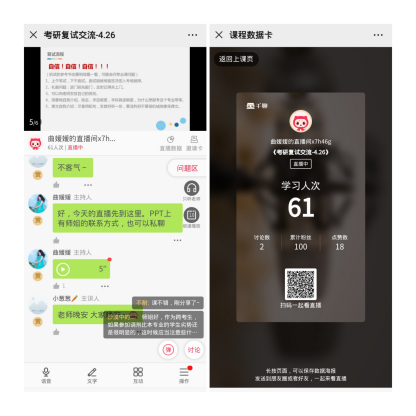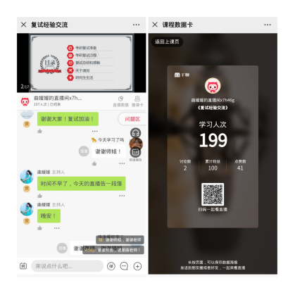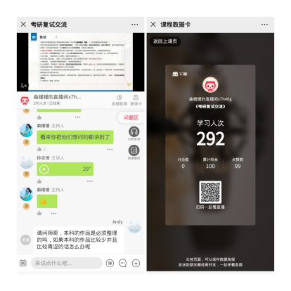 为做好2020届学生考研复试指导工作,4月23日-26日,色花堂 在微信千聊直播间举行了5场考研复试线上经验交流会。交流会邀请了我院往届优秀毕业生为同学们分享备考经验,200余名同学参与直播互动,毕业班辅导员曲媛媛主持会议。