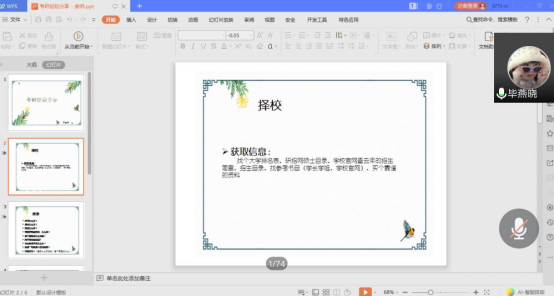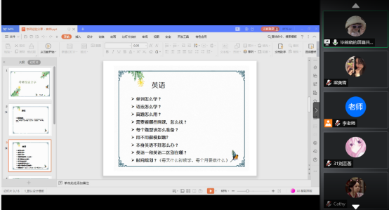 毕燕晓师姐着重向大家分享了英语和政治科目的学习经验,在详细介绍备考方法的同时,还向同学们分享了许多非常实用的学习软件与线上课程,尽可能的帮助大家顺利备考。此外,师姐还特别指出,在高压的备考过程中要劳逸结合,找到适合自己的学习节奏才能有效提高效率。