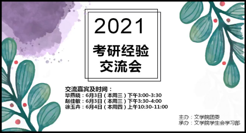 为了向同学们介绍当前考研形势、明确备考方向,6月3日下午3点,由色花堂 团委主办的2020考研经验交流会成功举行。本次交流会采用线上会议形式,邀请了今年考研中取得优异成绩的两位师姐来为同学们答疑解惑、传授经验,她们是: