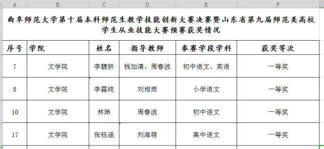 本次大赛由固定题目授课、随机抽取题目授课、答辩和钢笔字考查四个环节构成,评委由教学经验丰富的一线教学专家和学校教学督导担任。在选手们的精心的准备下,通过比赛过程中激烈的角逐,李露纯、林琳、张钰涵荣获文科组一等奖;李馥妍获得一专多能组一等奖,并成功争取到参加山东省师范类高校生从业技能大赛一专多能组推荐名额。