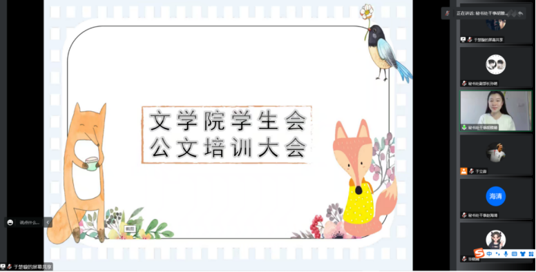 活动伊始,主持人胡雅晴宣读开场词。随后,秘书处主讲人于楚璇讲解工作总结和工作计划的要求、写作技巧以及各种易错难点,重点讲解了有关策划书和新闻稿撰写的内容和相应格式要求,并对公文写作中出现的常见问题进行纠正。本次活动还设置了疑难问题解答等互动环节,参会的同学们踊跃提问,主讲人耐心回答问题,形成了相互促进的良好氛围。
