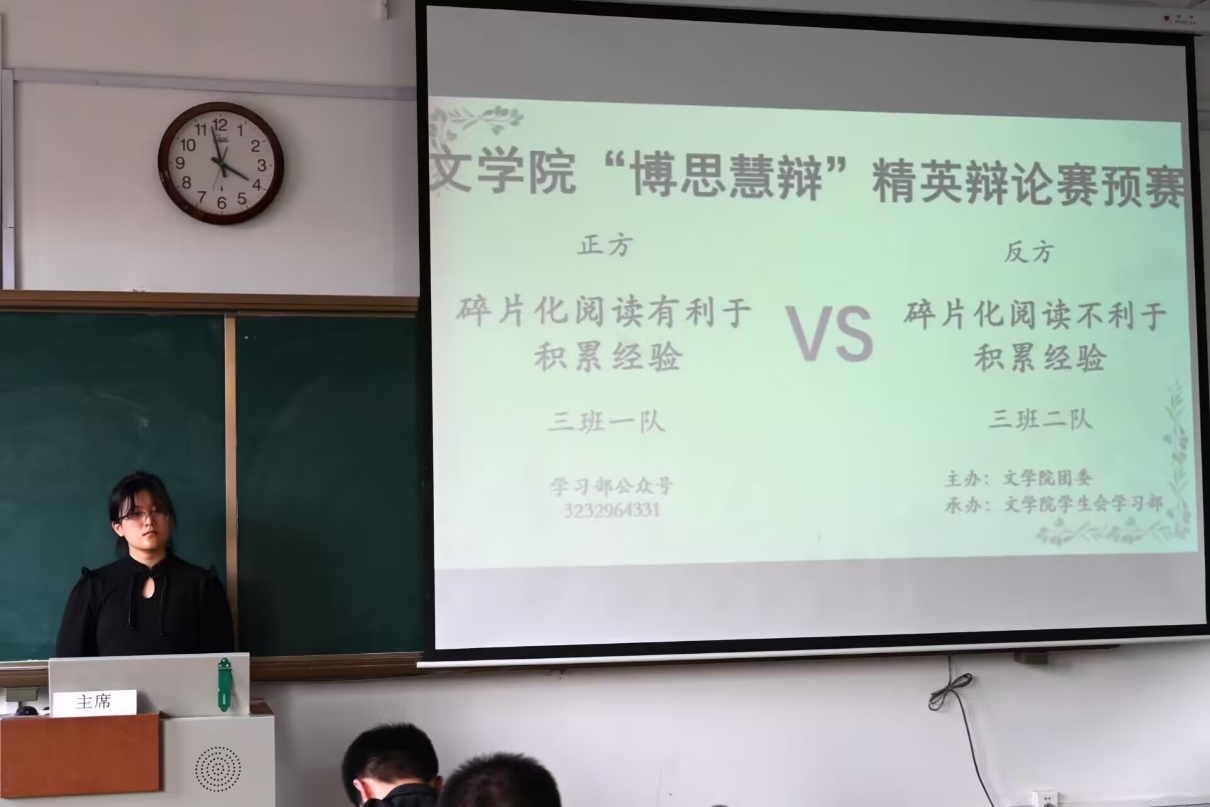 本次辩论赛预赛于多个赛场同时展开。主持人宣读规则后,比赛正式拉开序幕。在“碎片化阅读是否利于积累经验”辩论赛场的开篇立论阶段,正方一辩从碎片化阅读的益处和功能出发,肯定“碎片化阅读有利于积累经验”这一论点,阐释了己方的核心观点。反方四辩针对碎片化阅读的功能提出疑问,以碎片化阅读的弊端反驳对方观点。反方一辩从碎片化阅读的时间和知识增长的关系出发,举证数据,进行了详实的论证。申论与驳论环节,正方二辩提出“碎片化阅读越来越适应当下人们的阅读方式”的观点推动正反双方的讨论。反方二辩则开辟新的战场,举出人们阅读娱乐八卦文章的例子,与正方三辩展开激烈讨论。自由辩环节,两方辩手展开激烈交锋,各抒己见,双方论点得到了进一步碰撞和推进。总结陈词环节,反方四辩梳理战场,重申正方辩手在自由辩之中的漏洞,进行有力反驳,最后提出了碎片化阅读不能够满足人们经验的增长、知识的增加。正方四辩则选择重申己方论点,回应反方辩友在自由辩中的质疑,巩固了正方观点。