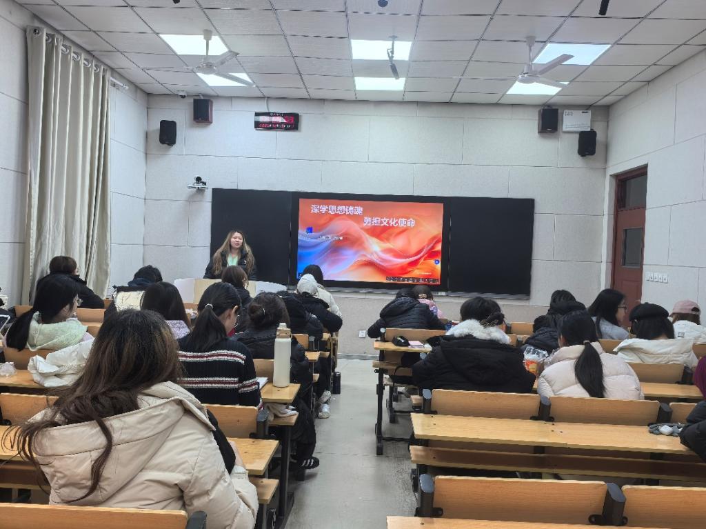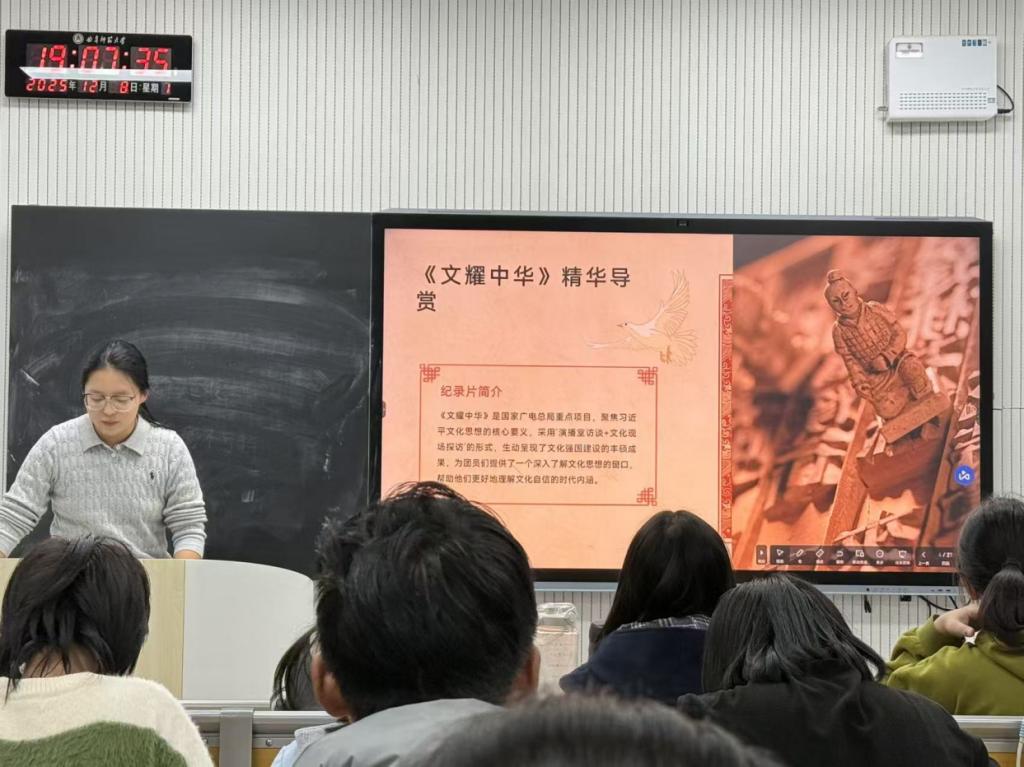 各团支部通过系统化、多层次的理论学习活动,引导青年学子深学细悟习近平文化思想。2024级1班、2班,2025级2班团支部以及光影影视协会、古风联盟社团开展主题班会宣讲,围绕习近平文化思想的核心要义进行系统讲解与专题解读;2024级8班、2025级1班团支部开展了习近平文化思想相关名词的讲解活动,并在此基础上结合专业特色进行延伸解读,引导同学们深化对习近平文化思想科学体系与实践要求的理解。