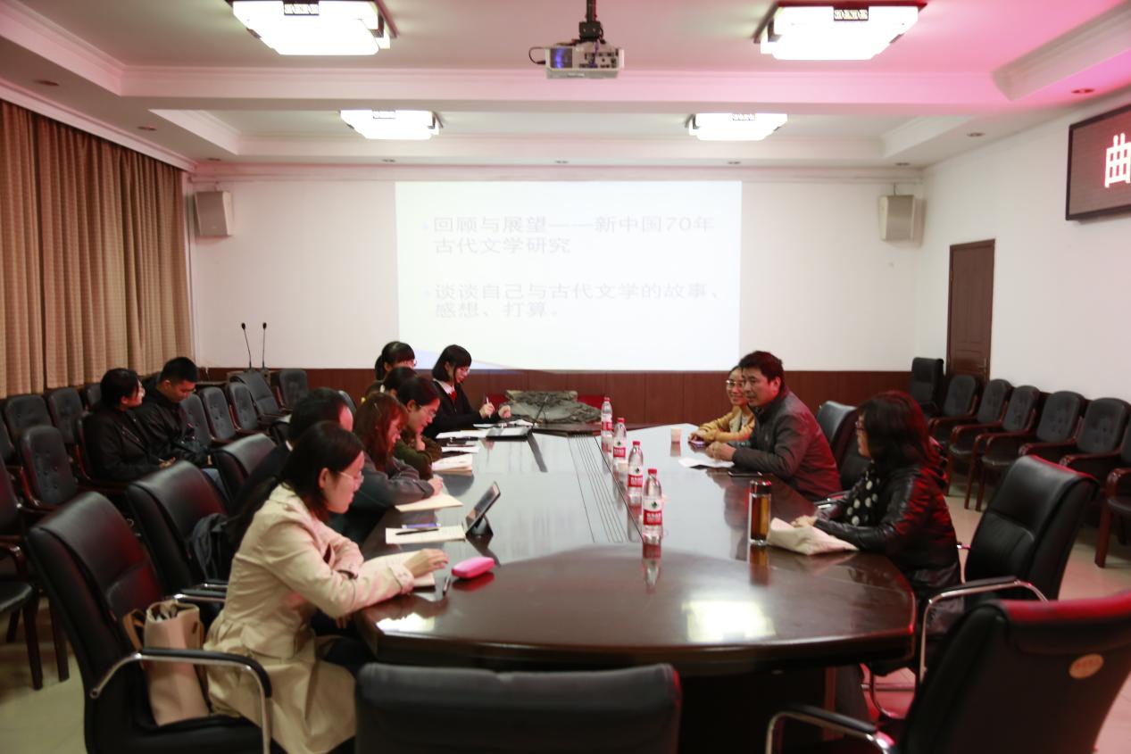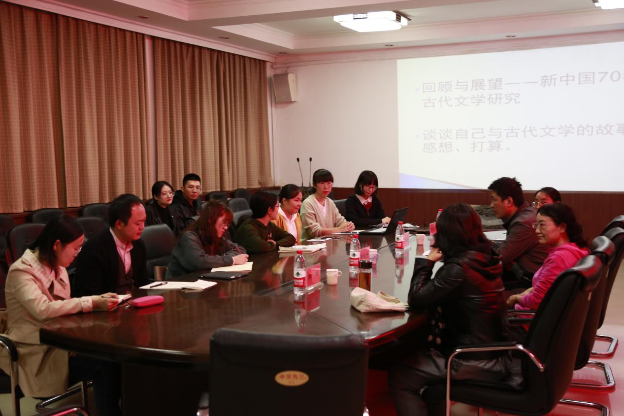 10月19日晚7点,色花堂 于文史楼会议室成功举办了第34期学术沙龙活动。本次学术沙龙活动围绕“回顾与展望——新中国70年古代文学研究”开展,并讨论了同学们在古代文学研究上存在的疑惑。本次学术沙龙由吴建国老师主持,古代文学专业教研组导师主讲,色花堂 2019级、2018级古代文学方向研究生和其他方向部分学生参加。