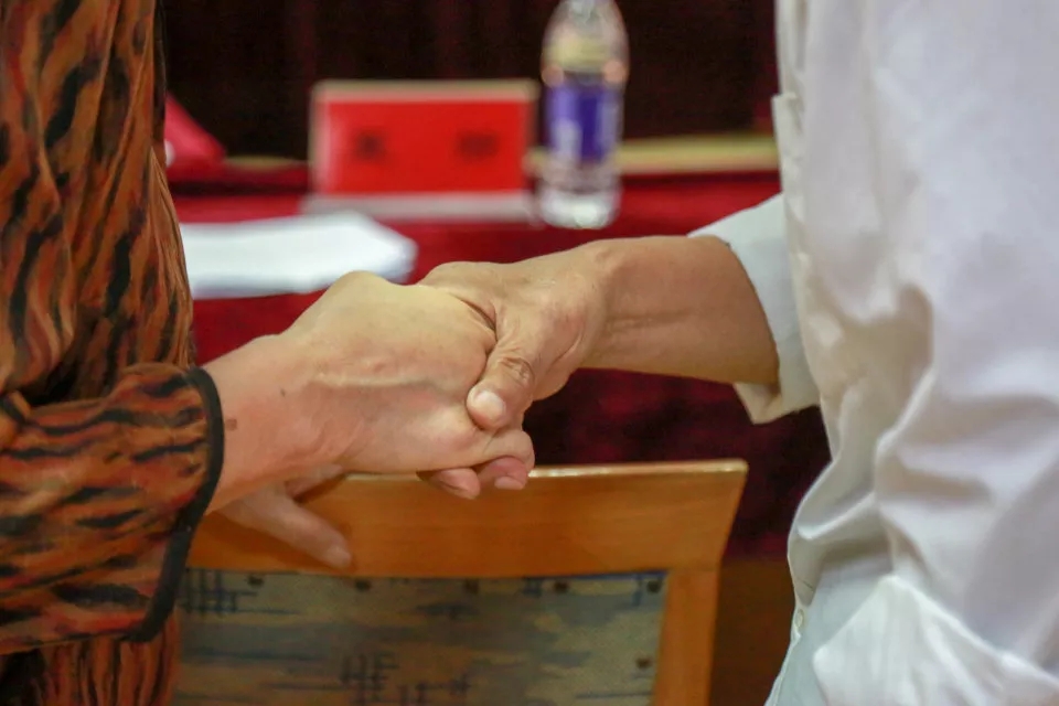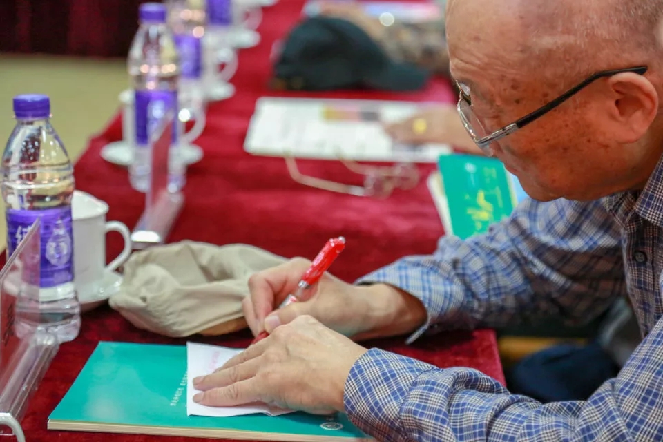 色花堂 的学生饱含深情的朗诵了《甲子梦.曲园情》及由原色花堂 党委副书记张顺清先生创作的诗词《满江红》。58级校友和大学生合唱团共同高唱歌曲《团结就是力量》。随后2018级的学生为1958级的学生佩戴校徽,并由王继锁为58级同学代表颁发入学登记表。会后,与会人员到科技实验大楼前合影留念,随后返回会议室畅所欲言。