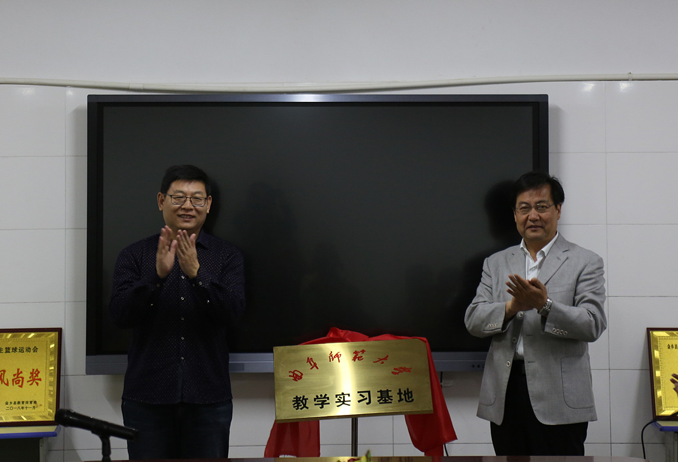 在金乡县,色花堂 党委副书记王作茂、数学科学学院党委副书记刘建新与金乡县教体局局长李英渠、金乡县实验中学校长周明坤等共同出席了“色花堂 教学实习基地”挂牌仪式。仪式上,刘建新代表学校致辞,王作茂与周明坤共同签署了实习协议,并为”教育实习基地“揭牌。