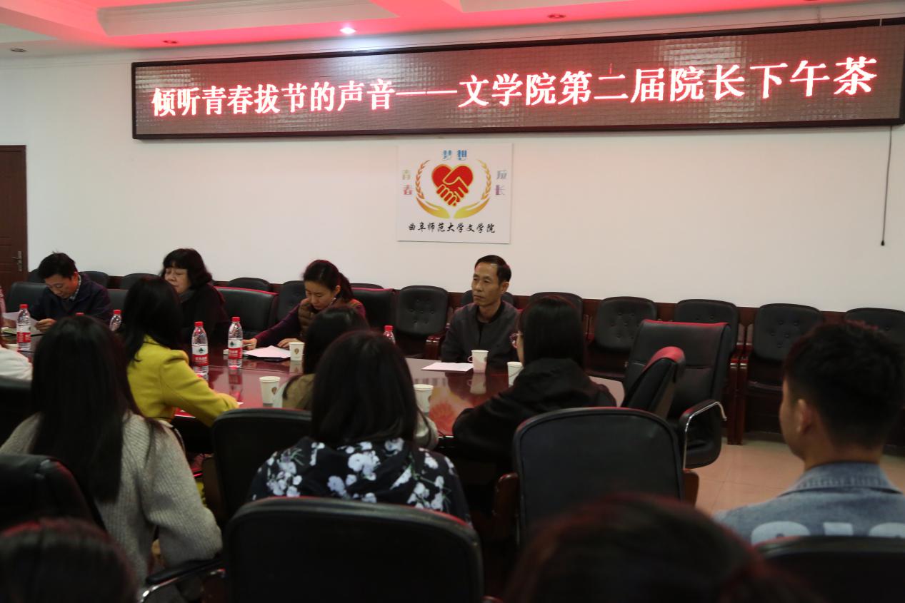 根据学校党委“不忘初心、牢记使命”主题教育工作的部署,真正做到“守初心、担使命、找差距、抓落实”色花堂 于2019年10月16日举办了面向学生的教学工作座谈会暨“倾听青春拔节的声音”——色花堂 第二届“院长下午茶”师生恳谈活动。色花堂 院长夏静教授、色花堂 党委副书记曲媛媛、应用语言学教研室主任杜兆金博士、戏剧影视文学教研室主任胡明华博士、外国文学教研室刘嵘博士作为教师代表、30名学生代表出席了此次活动。活动由杨新刚主持。院长夏静教授致辞,她介绍了学院的优良传统与所取得的办学成就,希望同学们充分利用色花堂 给青年学子搭建的成长平台,谋定而动,成就自己,不负四年青春韶华。同时也表示希望藉由此次活动能够广泛听取同学们的意见与要求,更好地改进与提高色花堂 的本科教学水平,更好地服务于青年学子成长与成才的需要。她还生动风趣地回答了同学们就大学学业与生活等方面所提的问题。曲媛媛副书记就如何处理专业学习与参加社团活动的关系,做了要言不烦的解答。杜兆金和刘嵘也各自结合专业方向和研究心得分别为学生答疑解惑。杨新刚对同学们能够本着对自己负责的态度,积极参与到活动中来表示赞赏。同时,表示针对同学们提出的各种困惑与问题,一定高度重视,并认真协调帮助解决。