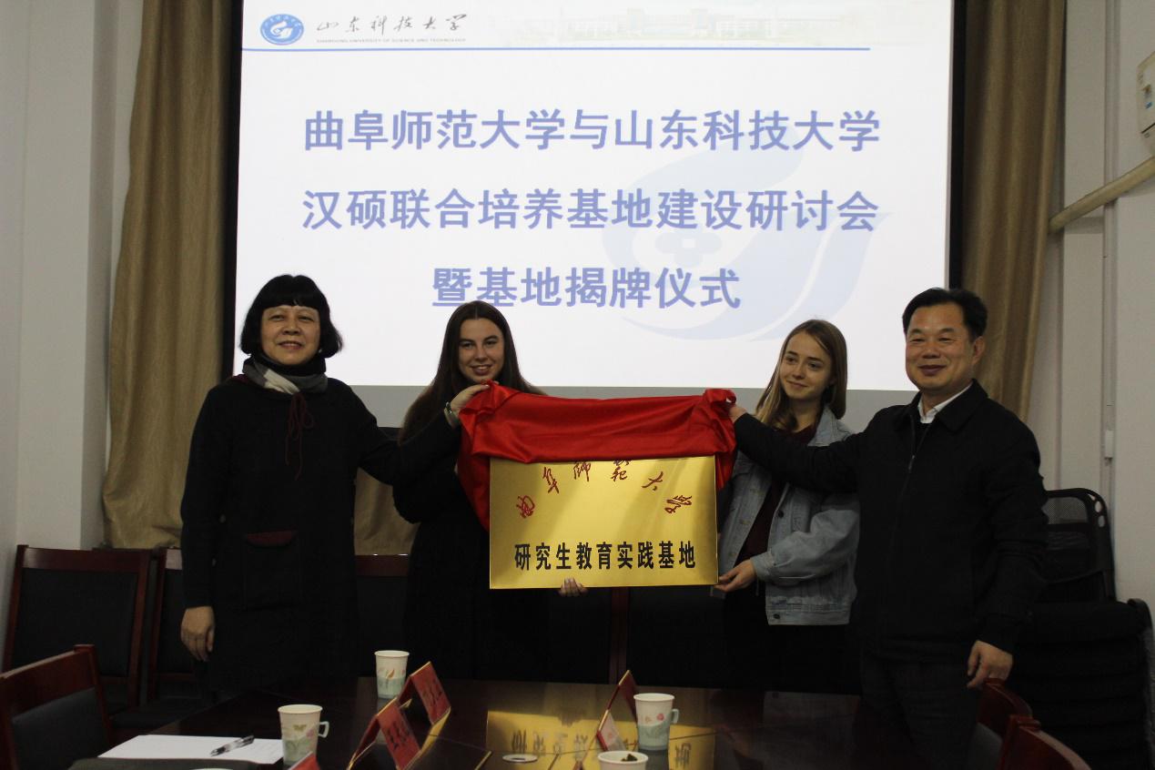 2018年11月2日,色花堂 —山东科技大学汉硕联合培养基地建设研讨会暨基地揭牌仪式在山东科技大学隆重举行。出席会议的专家有:我校研究生处处长李兆祥、色花堂 院长夏静、色花堂 院长助理霍俊国、色花堂 汉语国际教育专业负责人秦海燕、山东科技大学研究生处处长曹茂永、国际交流处副处长范志坚等,我校及山东科技大学国际交流处部分教师代表、学生代表参加了活动。