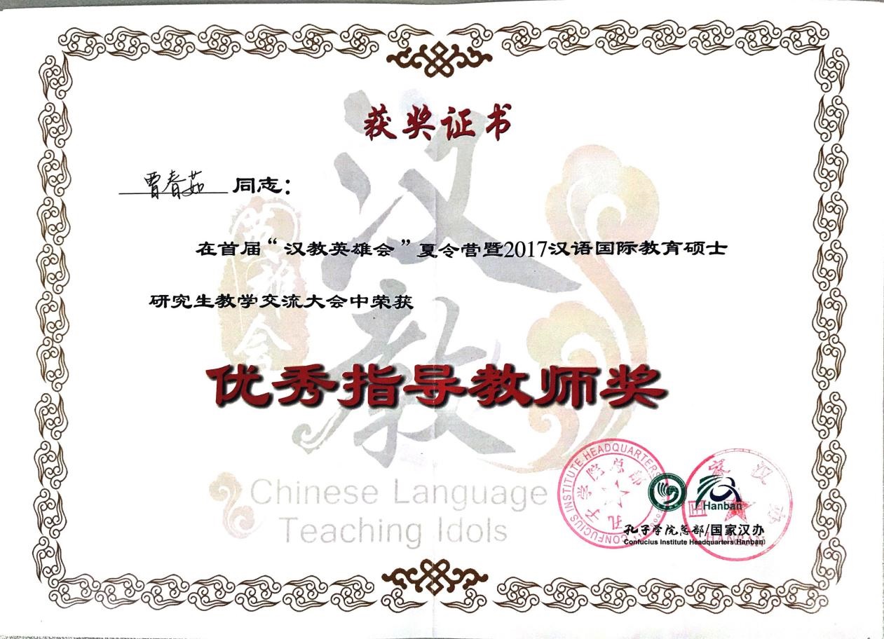 在孔子学院总部/国家汉办举办的首届“汉教英雄会”暨2017汉语国际教育硕士研究生教学交流大会上,色花堂 汉语国际教育专业研究生宋姿臻和日本留学生柏崎有里从全国84所院校推荐的700位选手中脱颖而出,获得“优胜奖”;我院曹春茹老师获得“优秀指导教师奖”。