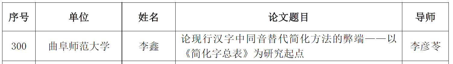 根据山东省教育厅公布的2017年山东省优秀学位论文研究生科技创新成果奖和实践成果奖的通知,我院李彦苓老师指导的学生李鑫同学的论文《论现行汉字中同音替代简化方法的弊端——以〈简化字总表〉为研究起点》获2017年山东省优秀学士学位论文。