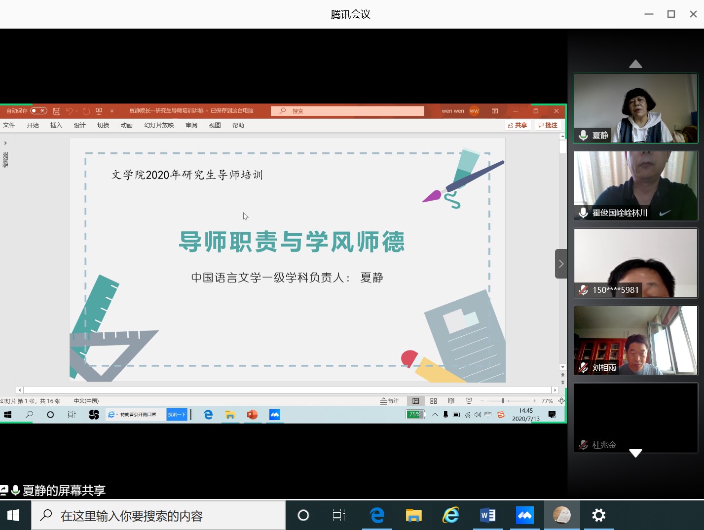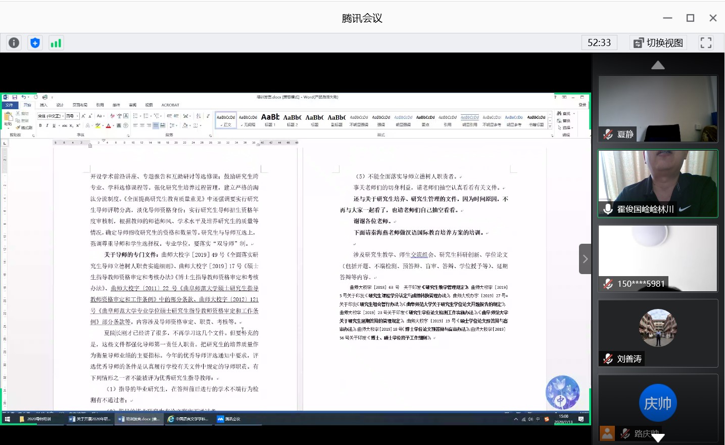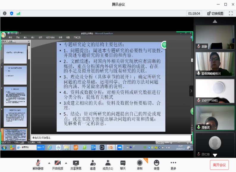 为进一步提高研究生导师指导能力、保证研究生培养质量,根据学校决定和要求,7月13日下午,色花堂 举办了2020年研究生导师线上培训会,全体研究生导师参加了此次会议。会议由院长助理霍俊国副教授主持。
