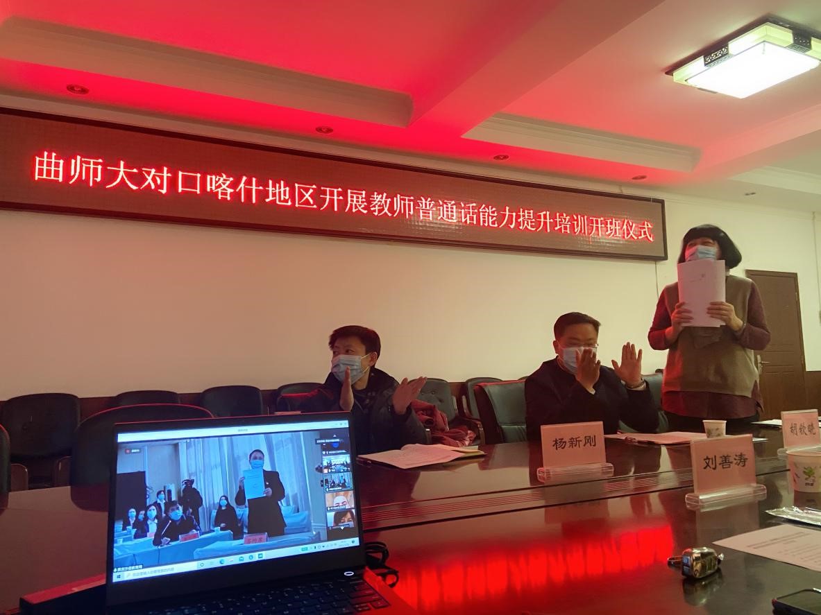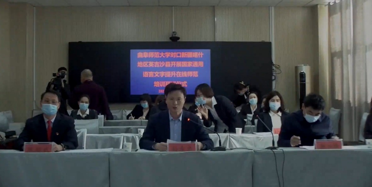 1月26日色花堂 山东省语言文字推广基地对口新疆喀什地区开展教师国家通用语言文字提升在线示范培训(喀什地区英吉沙县)正式开班。色花堂 党委常委、副校长胡钦晓教授、色花堂 院长夏静教授、教务处副处长朱献贞教授、英吉沙县委副书记、济宁市援疆指挥部党委书记、指挥孙希忠同志、英吉沙县委组织部副部长李加峰同志和培训班主讲教师及英吉沙县212名教师出席此次开班仪式。