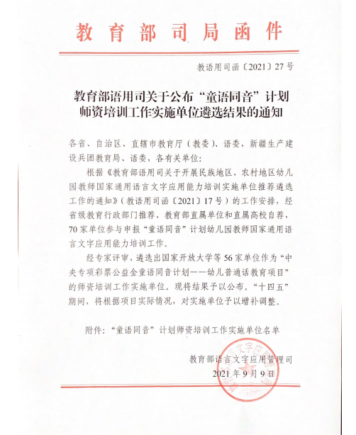 根据《教育部语用司关于开展民族地区、农村地区幼儿园教师国家通用语言文字应用能力培训实施单位推荐遴选工作的通知》(教语用司函[2021]17号)的工作安排,经省级教育行政部门推荐、教育部直属单位和直属高校自荐,遴选出全国56家单位作为“中央专项彩票公益金童语同音计划——幼儿普通话教育项目”的师资培训工作实施单位。