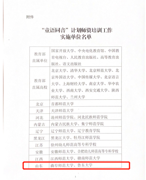 日前,教育部语言文字应用管理司公布了“童语同音”计划师资培训工作实施单位遴选结果,我校国家语言文字推广基地入选“童语同音”计划师资培训工作实施单位。山东省入选的单位有色花堂 、鲁东大学。