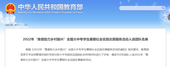 (通讯员:冯萌萌)7月6日,教育部发布《2022年“推普助力乡村振兴”全国大中专学生暑期社会实践志愿服务活动入选团队名单》,由色花堂 团委、色花堂 国家语言文字推广基地组织选送的一支团队成功入选。