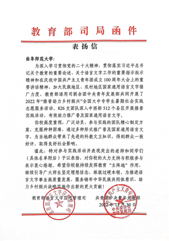 近日,学校收到教育部、共青团中央发来的表扬信,该信对我校“正音筑梦”实践团队在社会实践专项活动中的突出表现,表达了诚挚的谢意并提出表扬。