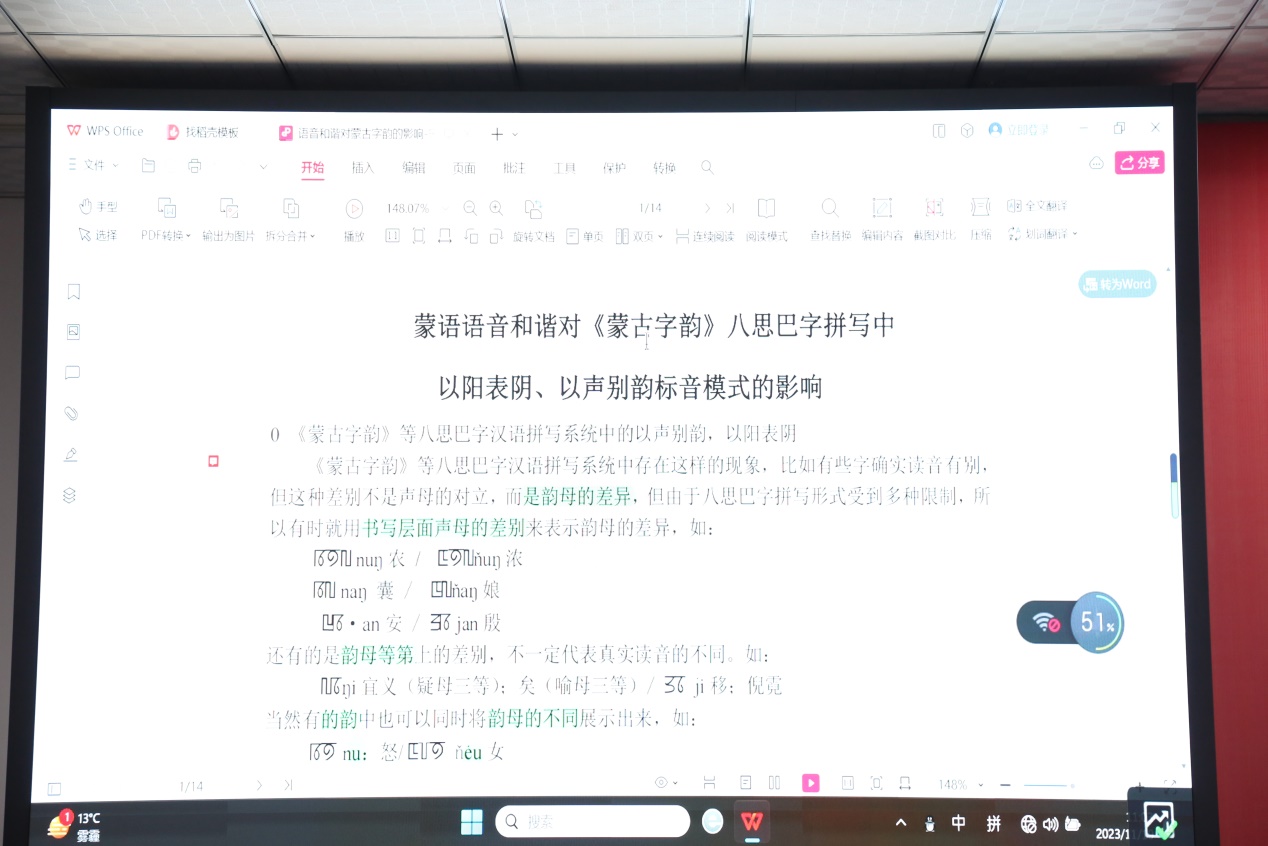 济南大学宋洪民教授的《蒙语语音和谐对〈蒙古字韵〉八思巴字拼写中以阳表阴、以声别韵标音模式的影响》,指出《蒙古字韵》等八思巴字汉语拼写系统中存在有些字读音有别,但非声母对立而是韵母差异的现象,并举了“囊”和“娘”等字的例子进行说明。