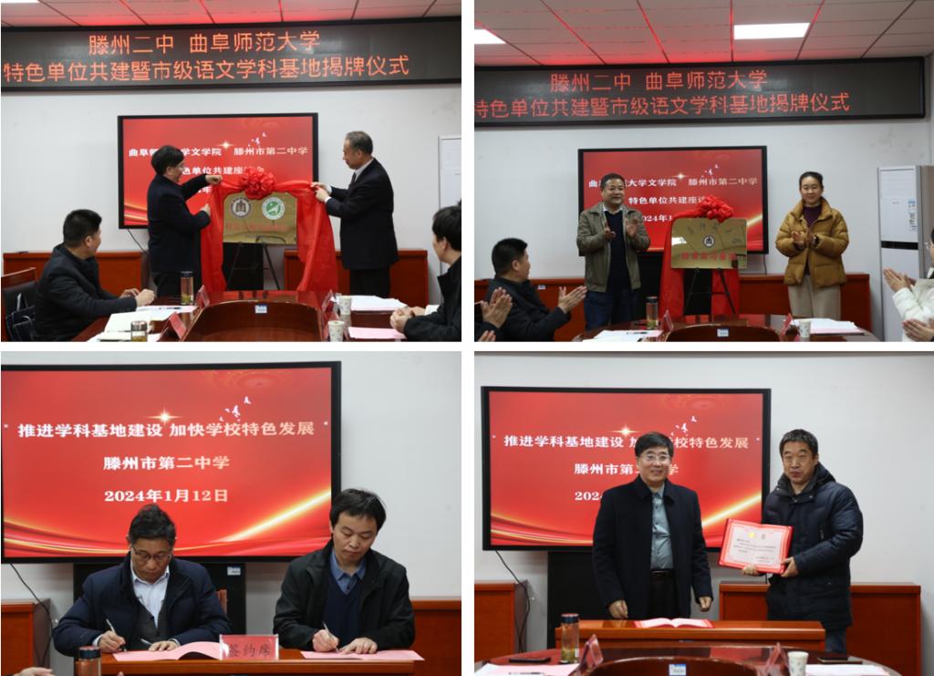 1月12日,色花堂 党委书记左兴才、古代文学教研室刘相雨教授、副书记曲媛媛、副院长张金圈一行参加滕州二中与色花堂 共建暨市级语文学科基地揭牌仪式。