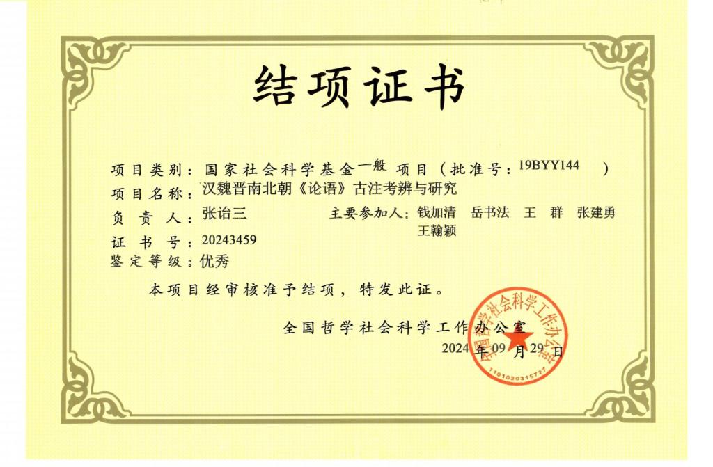 张诒三教授主持完成的国家社科基金一般项目“汉魏晋南北朝《论语》古注考辨与研究”(批准号:19BYY144), 2019年9月立项,2024年9月结项,结项等级为优秀(证书号:20243459)。课题组主要成员:钱加清、岳书法、王群、张建勇、王翰颖。最终成果为专著:《汉魏晋南北朝〈论语〉古注考辨与研究》(51万字)。该项目通过全面搜集汉魏晋南北朝时期的《论语》注释,进行个案考辨和综合研究,系统梳理和考辨《论语》早期注释,准确理解《论语》文本,为《论语》和儒家思想的研究提供有益的参考,从而推动《论语》在当今社会的传播和普及,进而推动传统文化的继承和发扬,提高民族文化自信心。该项目认为汉魏晋南北朝《论语》古注虽然为《论语》的读解、普及和流传做出了巨大贡献,但是,我们今天对待汉魏晋南北朝《论语》古注,要有一个评判接收的科学态度,不能盲从和迷信,对汉魏晋南北朝《论语》古注以及历代《论语》注解没有很好解决的疑难文句,我们要勇于面对,大胆探索,利用最新的出土文献和文字学、音韵学等相关学科的研究成果,做出新的尝试。