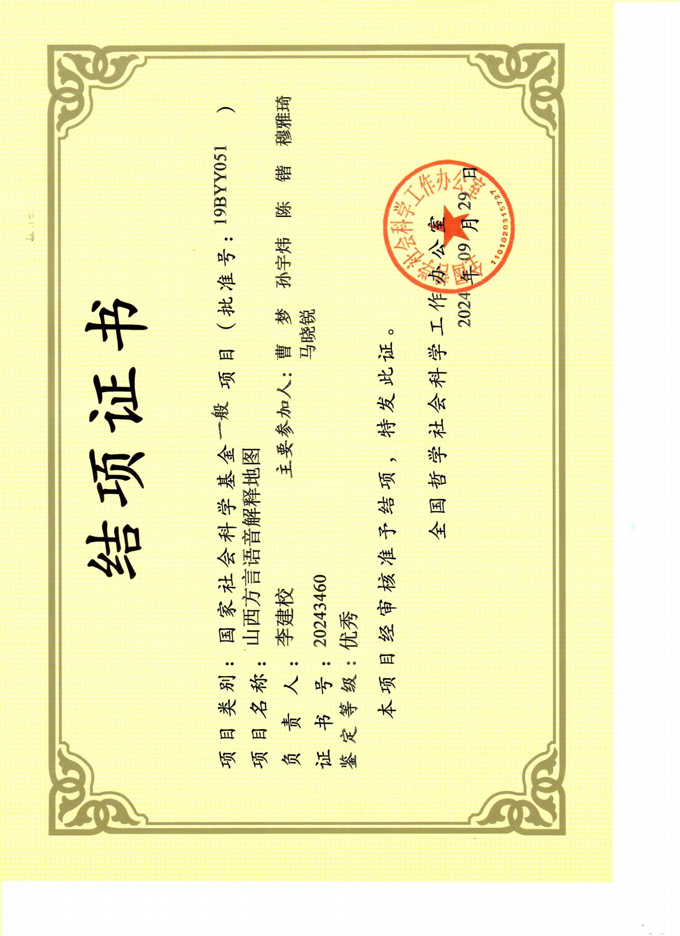 李建校教授主持完成的国家社科基金一般项目“山西方言语音解释地图:(项目批准号为:19BYY051),2019年9月立项,2024年9月结项,结项等级为优秀(证书号:20243460)。课题组主要成员:曹梦、孙宇炜、陈锴、穆雅琦、马晓锐。最终成果为专著:《山西方言语音解释地图——兼论汉语地理语言学研究内涵》(45万字)。该项目通过对山西方言440个方言点1731个单字对应关系的整理分析,归纳出136个能反映山西方言语音地域差异和古今演变语音地图条目,揭示了山西方言语音的演变层次、演变模式和演变机制,为构建统一完善的山西方言语音语料库提供了珍贵样本,对推动山西方言语音史乃至汉语语音史的构建具有重要价值,有利于保存山西方言语音的传统面貌,对方言本体的保护传承具有重要意义。通过与汉语方言学研究传统的结合,对经典的地理语言学理论及方法进行了符合汉语方言实际和研究传统的改造,丰富了汉语地理语言学理论内涵。