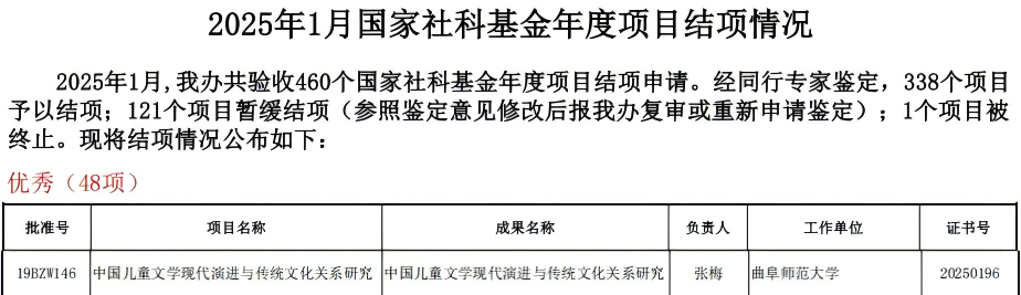 近日,全国哲学社会科学规划办公室公布了2025年1月份国家社科基金年度项目、青年项目和西部项目的结项情况,我院张梅教授主持完成的国家社科基金一般项目结项等级优秀。