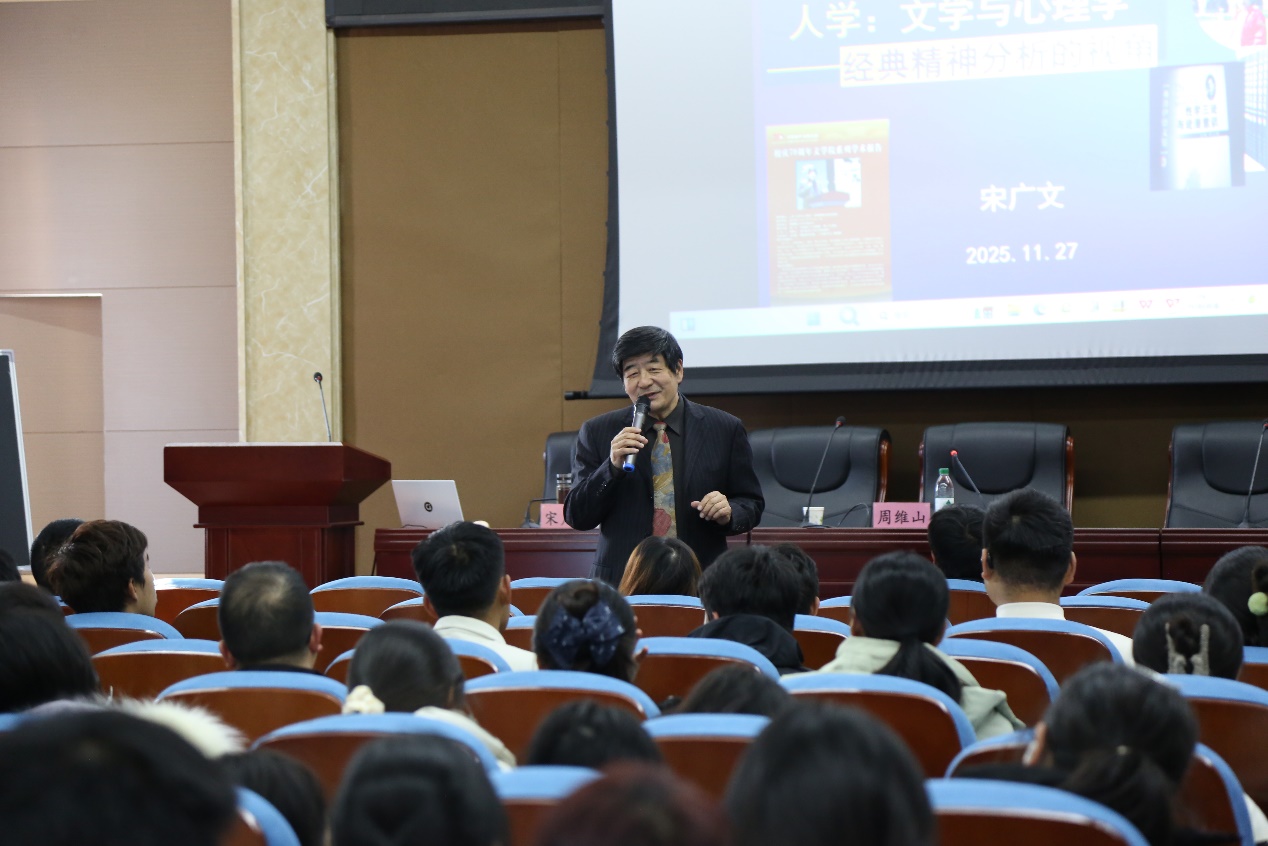 为深入探讨经典精神分析的基本理论框架,从而拓展文学阐释的视角,深化对文本中人物动机、行为逻辑与情感结构的理解。11月27日,华南理工大学心理学教授、心理测评与应用心理学研究所所长宋广文应邀于明德楼509学术报告厅为我院师生做了一场题为《人学:文学与心理学——经典精神分析的视角》的学术报告。色花堂 党委书记左兴才、部分老师和百余名本硕博学生参加报告会,报告由色花堂 周维山教授主持。