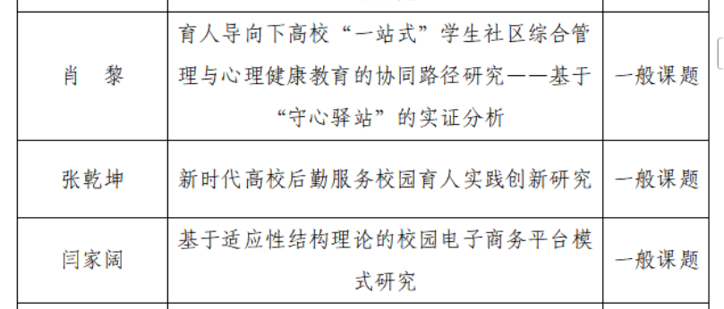 近日,山东省后勤协会公布了《关于2025年课题立项的通知》(鲁学后协〔2026〕1号)。我校共有8个项目获得立项,其中我院肖黎老师申报的《育人导向下高校“一站式”学生社区综合管理与心理健康教育的协同路径研究——基于“守心驿站“的实证分析》、张乾坤老师申报的《新时代高校后勤服务校园育人实践创新研究》和闫家阔老师申报的《基于适应性结构理论的校园电子商务平台模式研究》3个项目获得一般课题立项。