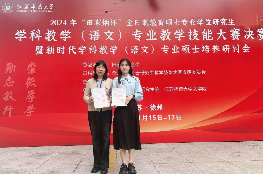 11月15日至17日,2024年全国“田家炳杯”全日制教育硕士学科教学(语文)专业教学技能大赛决赛在江苏师范大学隆重举行,我院2023级学科教学(语文)研究生于亚芳荣获二等奖,姜良存荣获“优秀指导教师”奖。